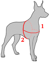 Messen Sie der "Brustumfang (2)" des Hundes 5 cm - 10 cm hinter den Vorderbeinen.